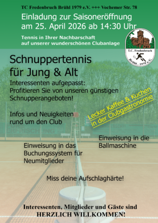 Am 25. April ab 14:30 Uhr tartet der TC Fredenbruch Brühl offiziell in die Sommersaison. Jede Menge Informationen und Aktionen rund um den Sport mit der gelben Filzkugel sind geplant. In wem steckt der nächste Alexander Zverev? Am Geschwindigkeitsmessgerät für Aufschläge kann sich jeder beweisen.